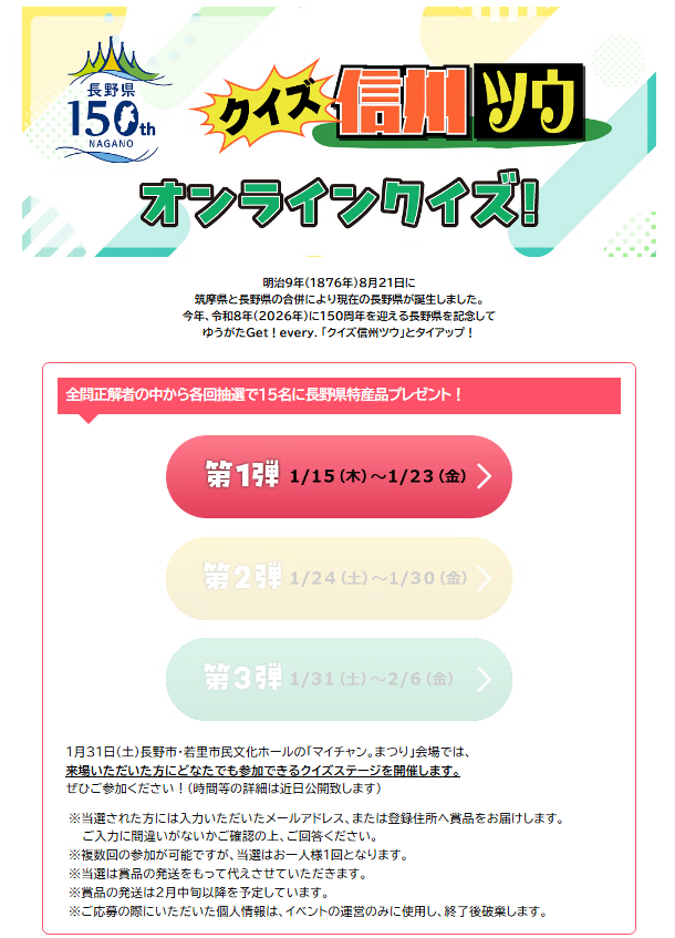 長野県にまつわるクイズに全問正解した方の中から抽選で、各回15名様に信州の特産品が当たります♪
