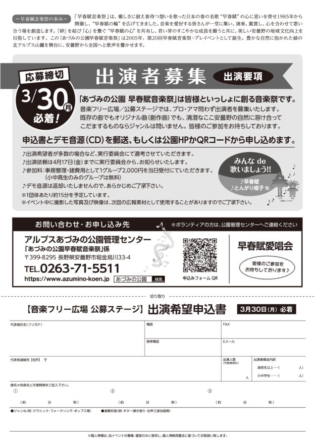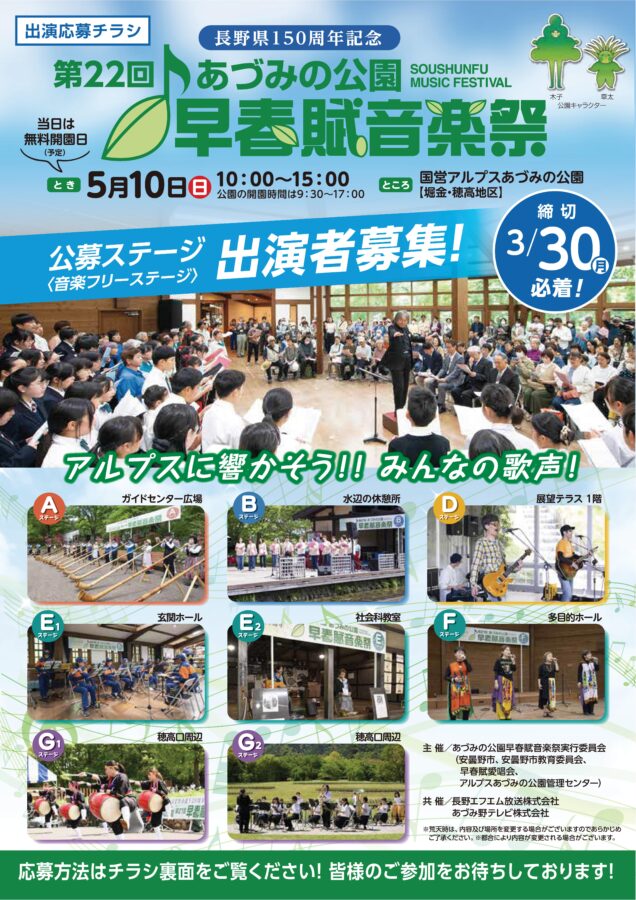 2026年5月10日(日)に、国営アルプスあづみの公園(堀金・穂高地区)にて「あづみの公園早春賦音楽祭」が開催されます。