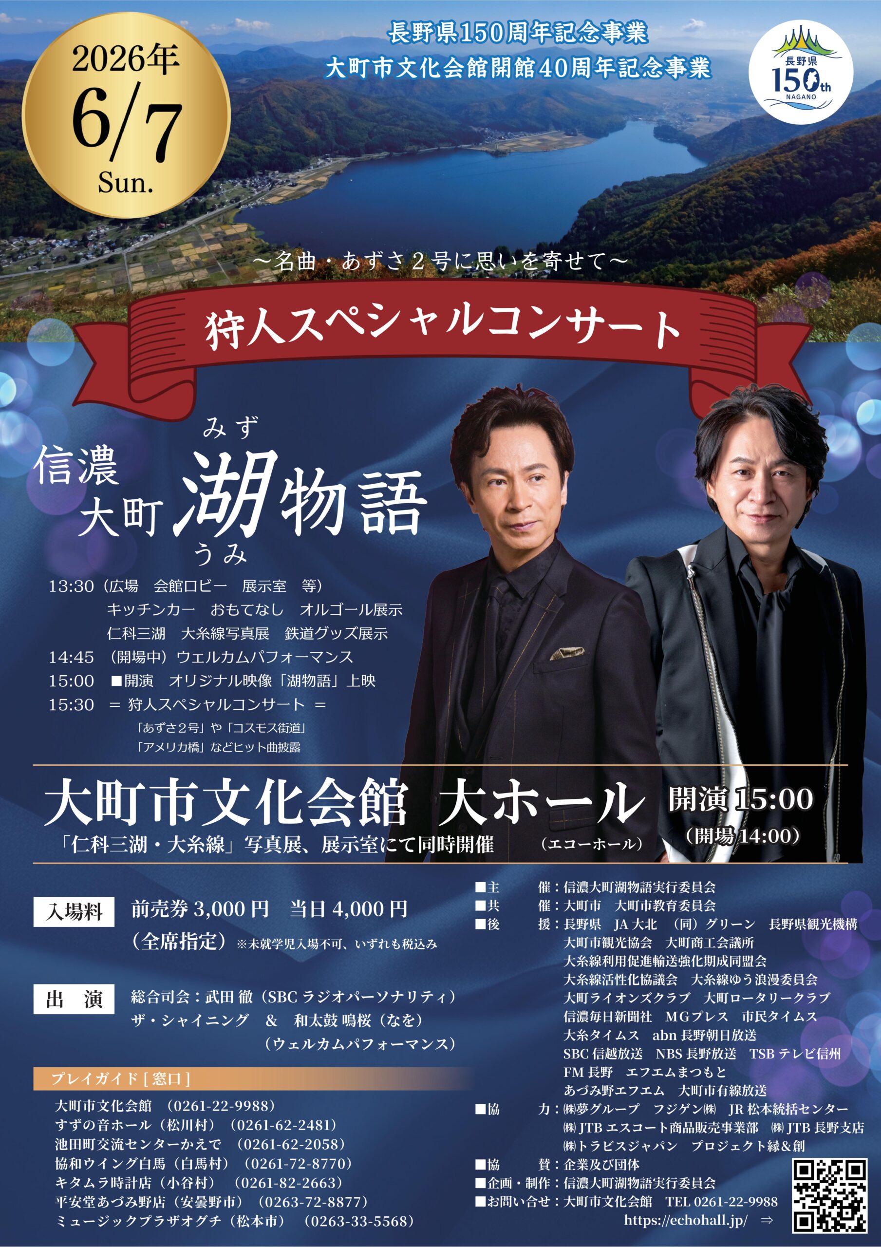長野県150周年記念・大町市文化会館会館40周年を記念して、名曲・あずさ2号に思いを寄せて「狩人スペシャルコンサート」を開催♪
