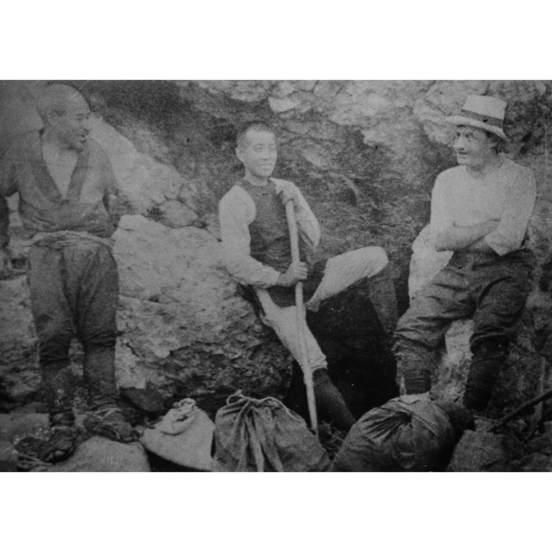 写真:上高地来訪時のウォルター・ウェストン(右)、上條嘉門次(左)・根本清蔵(中央)と共に